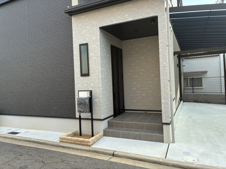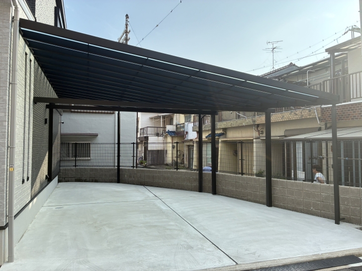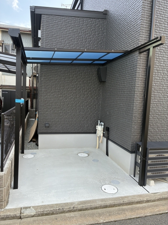 サイクルポート、カーポート、ポスト、玄関周りのタイル、フェンスの取付などの外構工事をさせていただきました。